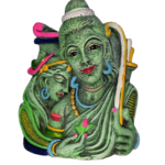 terracotta idol depicting the Hindu deities Lord Shiva and Goddess Parvati in an embrace. The idol is primarily painted in green with vibrant accents of red, blue, and yellow.